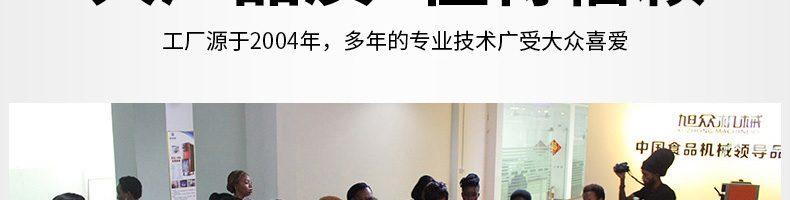 廣州旭眾食品機械有限公司是一家集科研開發,生產設計,營銷服務為一體的現代化生產企業。現代化生產車間,精湛制造技術,所產機械歷經市場重重考驗,不斷贏得海內外客戶的贊譽。