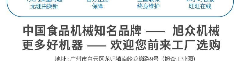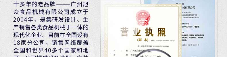 廣州旭眾食品機械有限公司是一家集科研開發,生產設計,營銷服務為一體的現代化生產企業。現代化生產車間,精湛制造技術,所產機械歷經市場重重考驗,不斷贏得海內外客戶的贊譽。