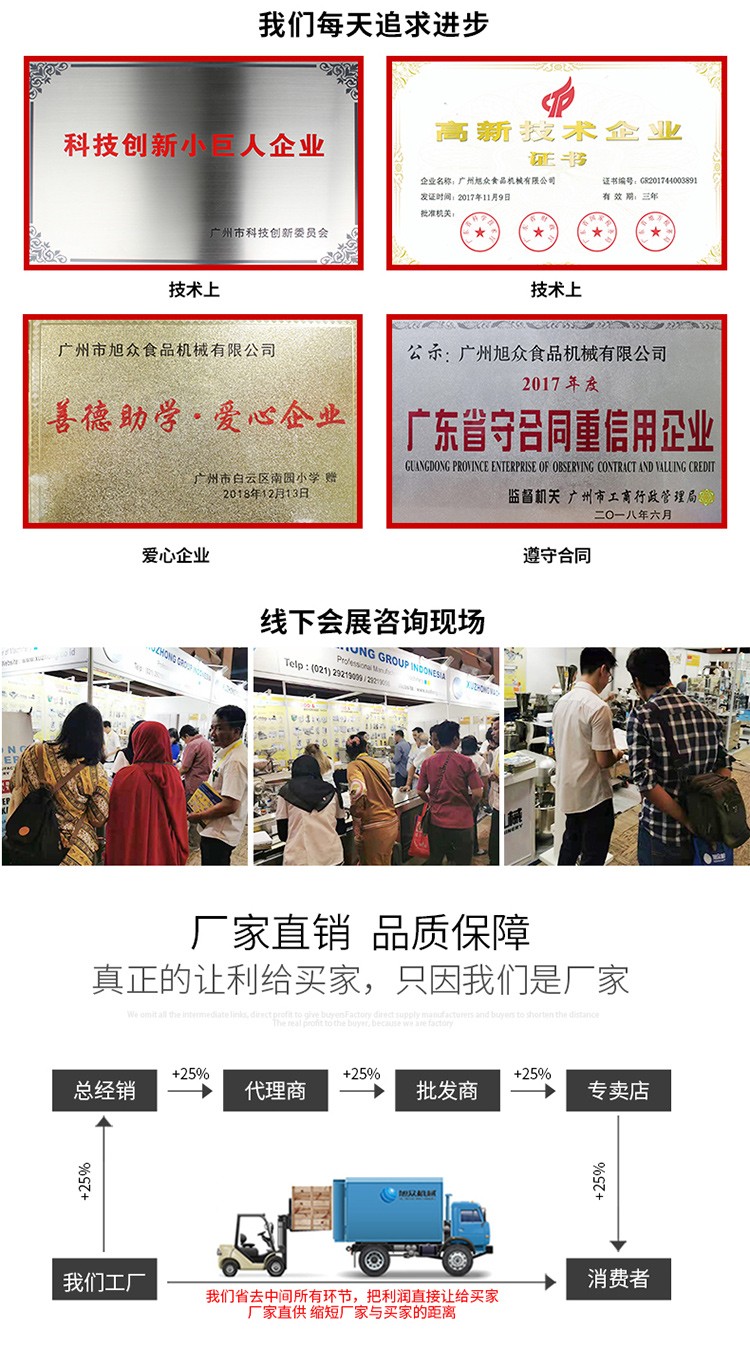 廣州旭眾食品機械有限公司是一家集科研開發,生產設計,營銷服務為一體的現代化生產企業。現代化生產車間,精湛制造技術,所產機械歷經市場重重考驗,不斷贏得海內外客戶的贊譽。