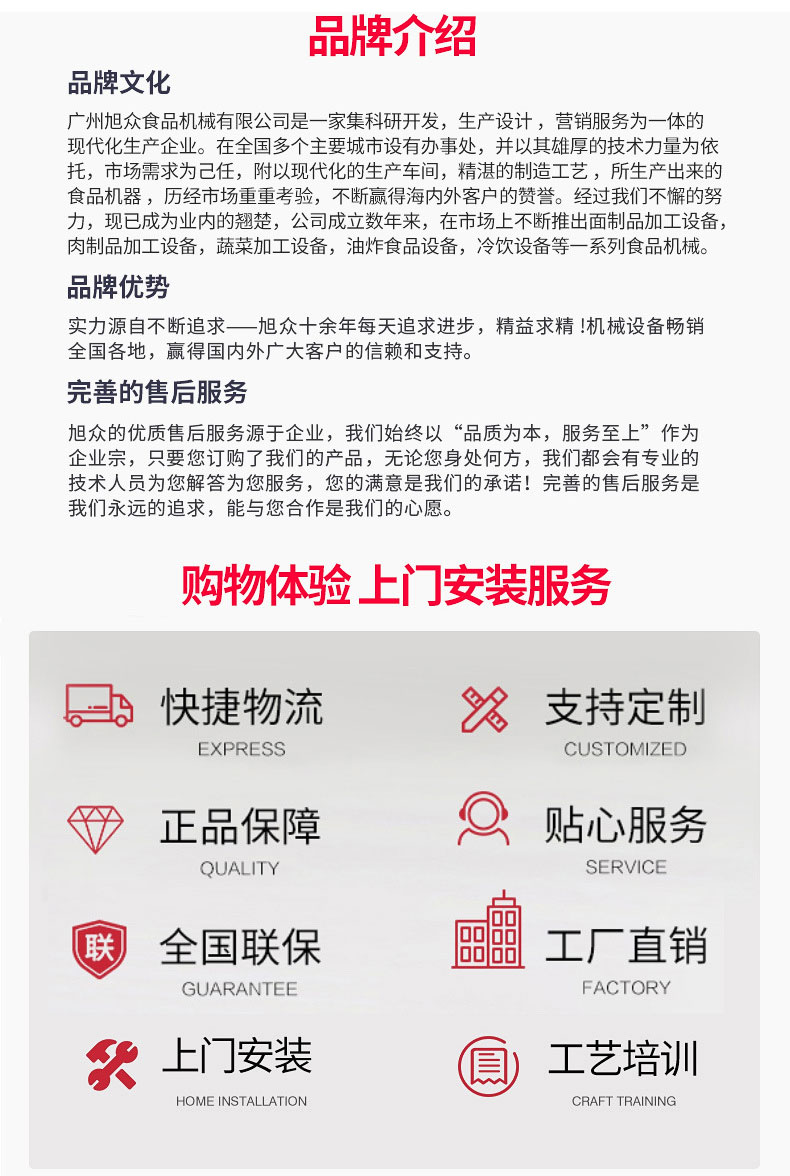 廣州旭眾食品機(jī)械有限公司是一家集科研開發(fā),生產(chǎn)設(shè)計(jì),營(yíng)銷服務(wù)為一體的現(xiàn)代化生產(chǎn)企業(yè)。現(xiàn)代化生產(chǎn)車間,精湛制造技術(shù),所產(chǎn)機(jī)械歷經(jīng)市場(chǎng)重重考驗(yàn),不斷贏得海內(nèi)外客戶的贊譽(yù)。