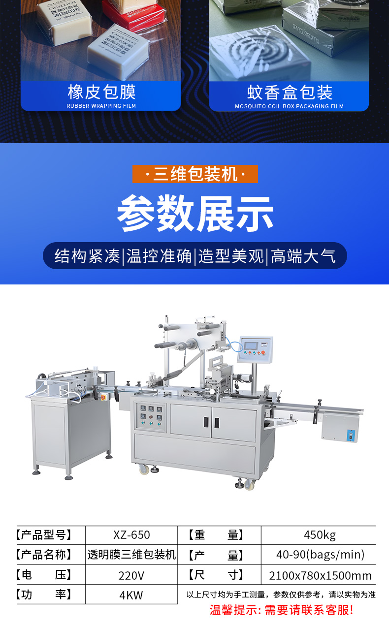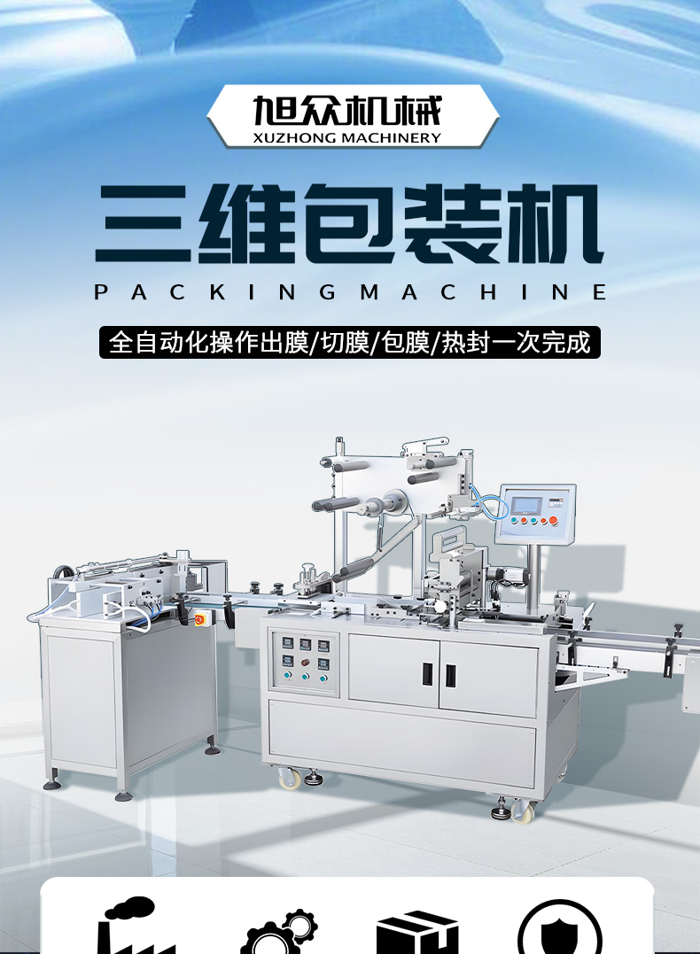 XZ-650包裝機,三維包裝機,全自動化操作出膜、切膜、包膜、熱封一次完成。可廣泛應用多種產品,適用包裝的產品有食品、撲克牌、香煙盒化妝品、日用品、文具用品等類型產品。