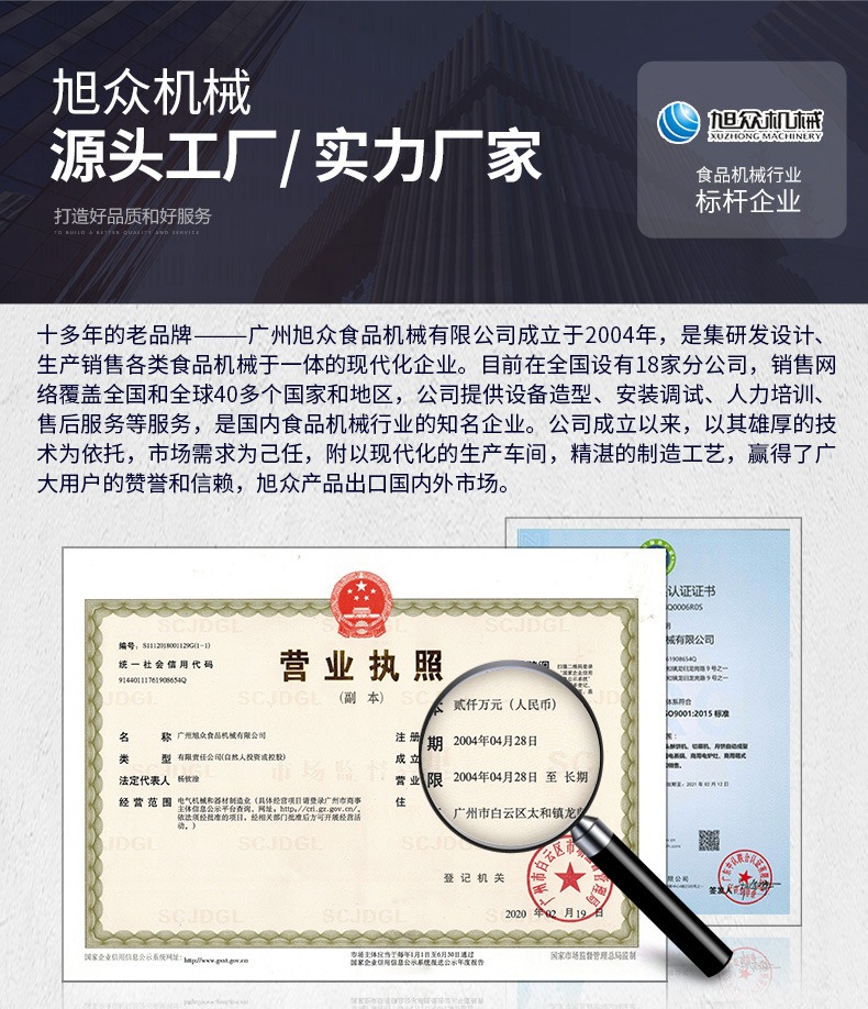 廣州旭眾食品機(jī)械有限公司是一家集科研開發(fā),生產(chǎn)設(shè)計(jì),營(yíng)銷服務(wù)為一體的現(xiàn)代化生產(chǎn)企業(yè)。現(xiàn)代化生產(chǎn)車間,精湛制造技術(shù),所產(chǎn)機(jī)械歷經(jīng)市場(chǎng)重重考驗(yàn),不斷贏得海內(nèi)外客戶的贊譽(yù)。