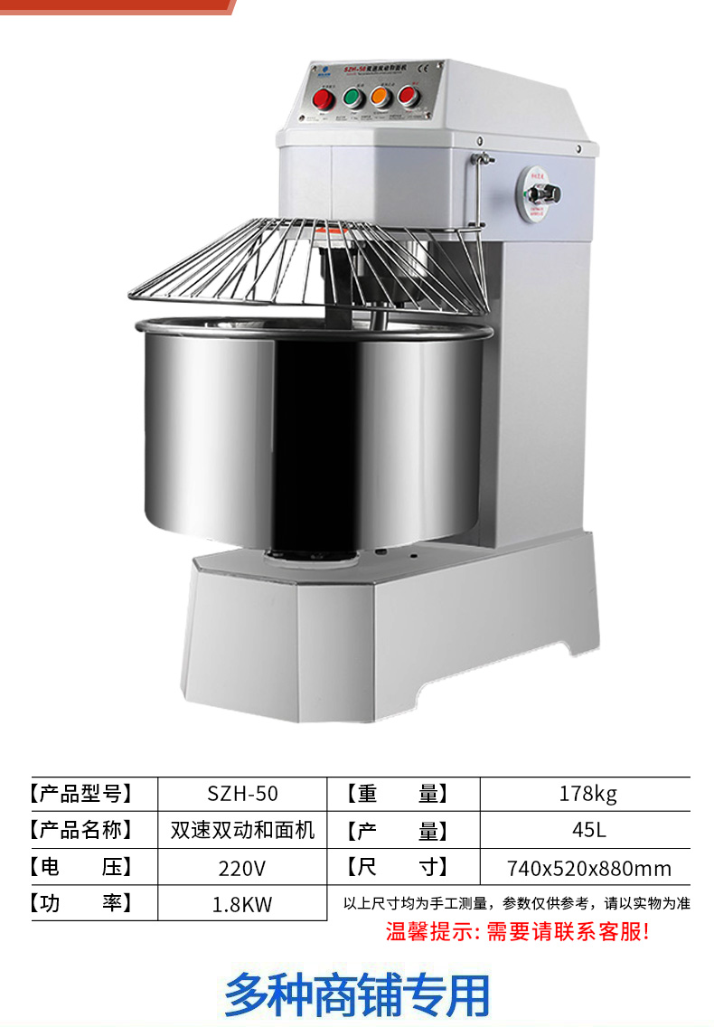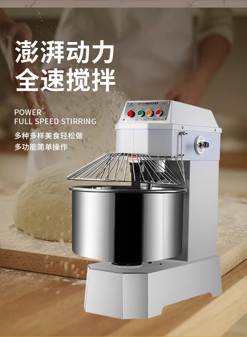 SZH-50型雙速雙動(dòng)和面機(jī),本機(jī)適合攪拌各種面包、包子、饅頭、湯圓、披薩餅面團(tuán),專(zhuān)業(yè)設(shè)計(jì)避免面團(tuán)過(guò)分升溫并確保面團(tuán)含氧量。過(guò)載、缺相保護(hù)裝置,防護(hù)罩安全連動(dòng)裝置。