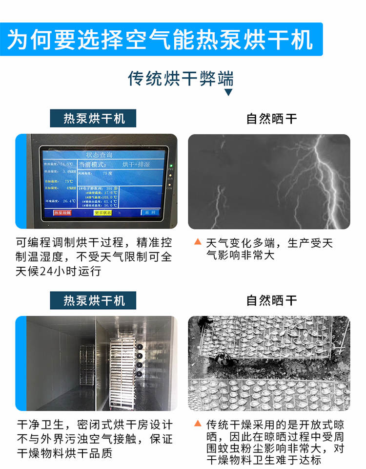 030S-T-KD06空氣能烘干機(jī),可編程調(diào)制烘干過程,精準(zhǔn)控制溫濕度,不受天氣限制可全天候24小時(shí)運(yùn)行。干凈衛(wèi)生,密閉式烘干房設(shè)計(jì)不與外界污濁空氣接觸,保證干燥物料烘干品質(zhì)。高效節(jié)能,不用專人看守,可實(shí)現(xiàn)一人同時(shí)管理多間烘房減少人工費(fèi)用