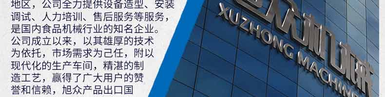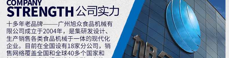 廣州旭眾食品機械有限公司是一家集科研開發,生產設計,營銷服務為一體的現代化生產企業。現代化生產車間,精湛制造技術,所產機械歷經市場重重考驗,不斷贏得海內外客戶的贊譽。