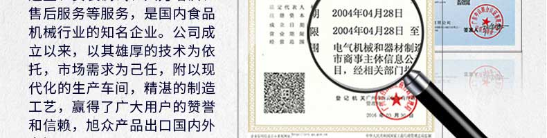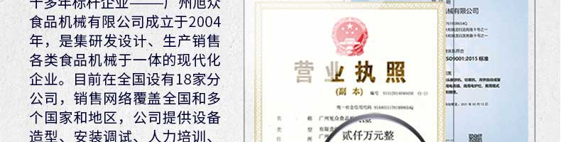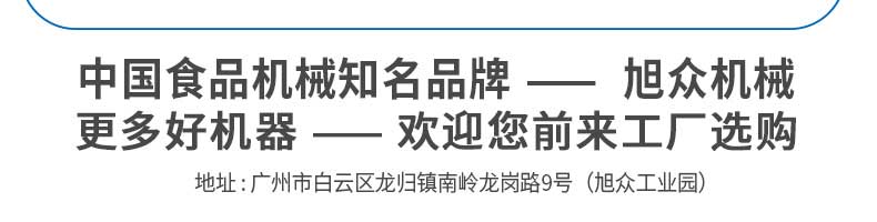 廣州旭眾食品機(jī)械有限公司是一家集科研開發(fā),生產(chǎn)設(shè)計,營銷服務(wù)為一體的現(xiàn)代化生產(chǎn)企業(yè)。現(xiàn)代化生產(chǎn)車間,精湛制造技術(shù),所產(chǎn)機(jī)械歷經(jīng)市場重重考驗,不斷贏得海內(nèi)外客戶的贊譽(yù)。