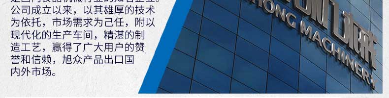 廣州旭眾食品機械有限公司是一家集科研開發,生產設計,營銷服務為一體的現代化生產企業?,F代化生產車間,精湛制造技術,所產機械歷經市場重重考驗,不斷贏得海內外客戶的贊譽。