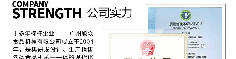 廣州旭眾食品機械有限公司是一家集科研開發,生產設計,營銷服務為一體的現代化生產企業。現代化生產車間,精湛制造技術,所產機械歷經市場重重考驗,不斷贏得海內外客戶的贊譽。