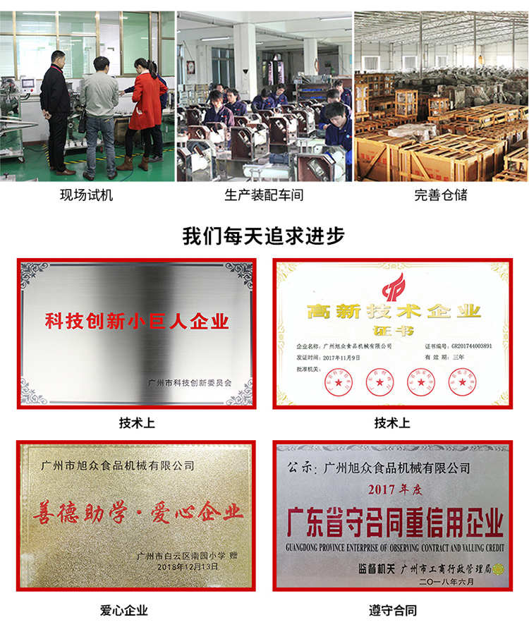廣州旭眾食品機械有限公司是一家集科研開發,生產設計,營銷服務為一體的現代化生產企業。現代化生產車間,精湛制造技術,所產機械歷經市場重重考驗,不斷贏得海內外客戶的贊譽。