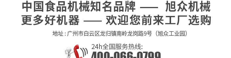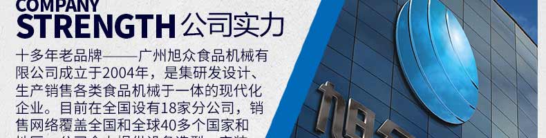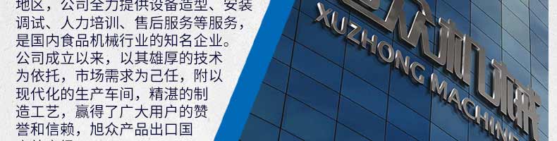 廣州旭眾食品機械有限公司是一家集科研開發,生產設計,營銷服務為一體的現代化生產企業。現代化生產車間,精湛制造技術,所產機械歷經市場重重考驗,不斷贏得海內外客戶的贊譽。