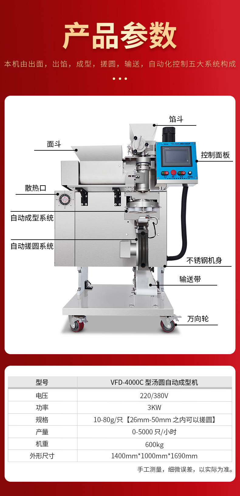 名稱VFD-4000型湯圓自動成型排盤一體機 電源220/380V(見機器名牌) 功率3KW 產量0-5000只 尺寸1400mm*1000mm*1690mm 重量600kg 規格10-80g/只【26mm-50mm之內可以搓圓】 其他