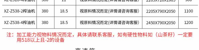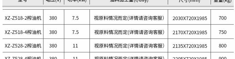 名稱XZ-Z518、XZ-Z528、XZ-Z538系列榨油機 電源380V 功率視型號而定7.5~18.5KW請下拉可查明細 產量視原料情況而定 尺寸視型號而定2030*720*1985mm~2450*790*2050mm請下拉可查明細 重量視型號而定700~1200KG請下拉可查明細 規格 其他