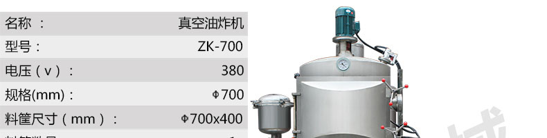 名稱zk-700雙室低溫真空油炸機 電源380V 功率11+3kw 產量15-60kg/次 尺寸1600*1600*2700mm 重量 規格料框數量1組;加熱方式:導熱油 其他